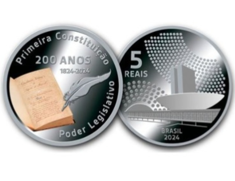 O Banco Central lançou nesta quinta-feira (11) uma moeda de cinco reais em comemoração aos 200 anos da primeira Constituição do Brasil. A peça será produzida em prata e terá uma tiragem inicial de três mil unidades, segundo o BC.
