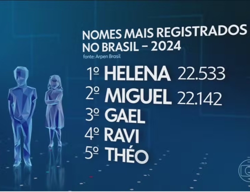 E não são só eles que acham lindo não. Helena desbancou Miguel e é o nome mais registrado no Brasil em 2024. Miguel, que liderou nos últimos quatro anos, ficou em segundo lugar, seguido de Gael, Ravi e Théo.