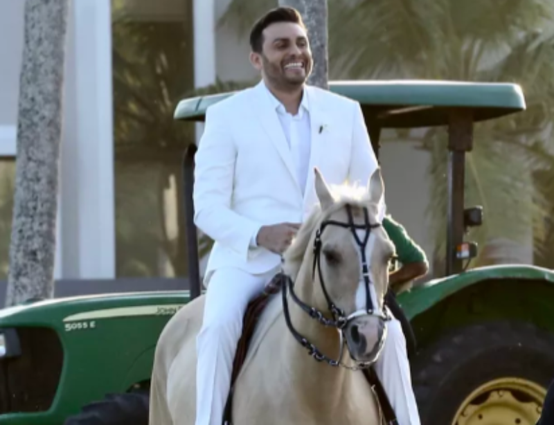 O cantor chegou à cerimônia montado em um cavalo ao som do seu sucesso "Não deixo não". Mano Walter, usou um terno Ricardo Almeida, desceu do cavalo e foi até ao altar acompanhado da mãe.