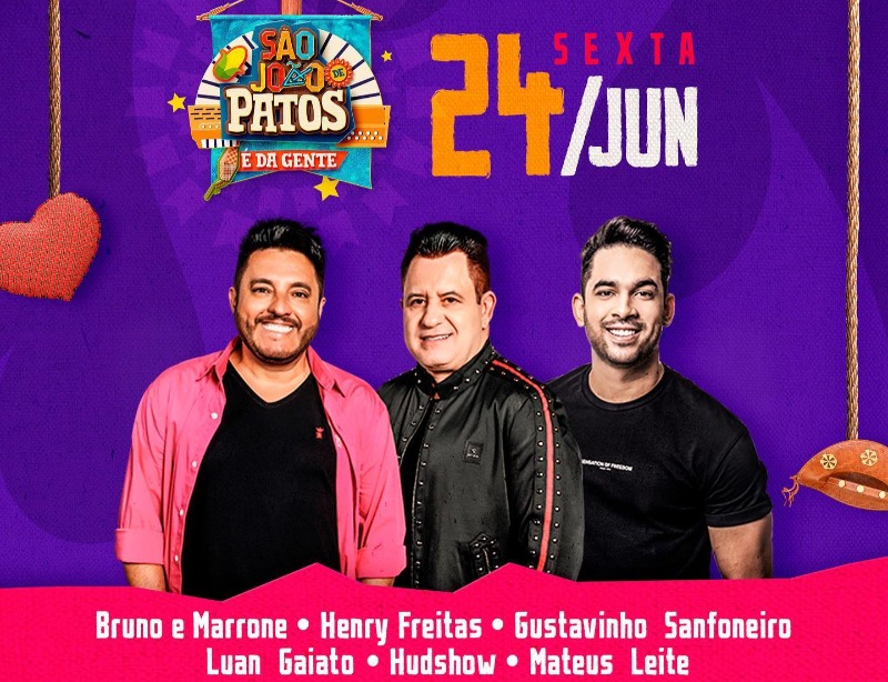 Os shows do São João 2022 de Patos terminam nesta sexta-feira (24), noite de São João. Para o encerramento, se apresentam no Terreiro do Forró nomes como Bruno e Marrone e Henry Freitas. Os shows começam a partir das 21h.