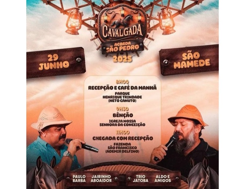 Com a Cavalgada "Acorda São Pedro”, neste domingo, 29 de junho, o município de São Mamede abre os festejos do seu tradicional São Pedro, edição 2025 que traz como tema ‘Tradição que se Renova’. A cavalgada promete reunir cavaleiros e amazonas de toda a região, “um evento que é parte do coração do nosso povo, cavalgada é tradição, é cultura”, destacou o prefeito Chaguinha Lopes, um dos cavaleiros incentivadores dessa prática esportiva.
