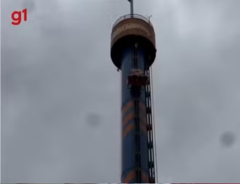 As imagens mostram o momento em que as demais cadeiras da torre descem normalmente, enquanto a que levava a família permanece parada a cerca de 100 metros de altura.