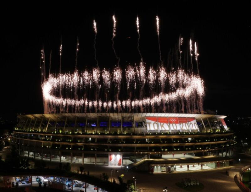 Por causa da pandemia do coronavírus, o Japão teve de reduzir os custos das cerimônias de abertura e encerramento. Ainda assim, a festa deste domingo foi marcada por um show de luzes na formação dos aros olímpicos, simbolizando a energia de todos os torcedores que não puderam estar nas arquibancadas.