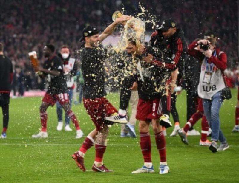 Após a partida, enquanto a torcida festejava na arquibancada, jogadores e comissão técnica do Bayern de Munique fizeram a festa no gramado. E não faltou, é claro, o tradicional banho de cerveja na comemoração. Nem o treinador Julian Nagelsmann foi poupado.