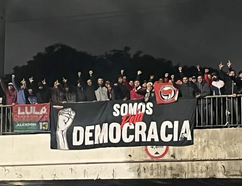 No alto da ponte, parte dos torcedores grita “democracia” e pendura uma bandeira com a frase: “Somos pela democracia”. Eles também soltam rojões.