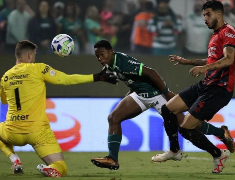 O time de Abel Ferreira precisou de apenas 5 minutos para largar na frente. Depois de um erro da defesa adversária, Raphael Veiga tocou, e Endrick tocou por cima de Bento para fazer 1 a 0.