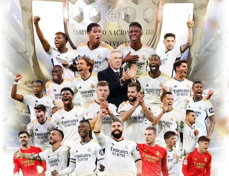 O Real Madrid conquista o título com uma campanha histórica. O time comandado por Carlo Ancelotti venceu 27 partidas das 34 disputadas até agora em LaLiga, empatou seis e foi derrotado somente para o Atlético de Madrid, em setembro de 2023.