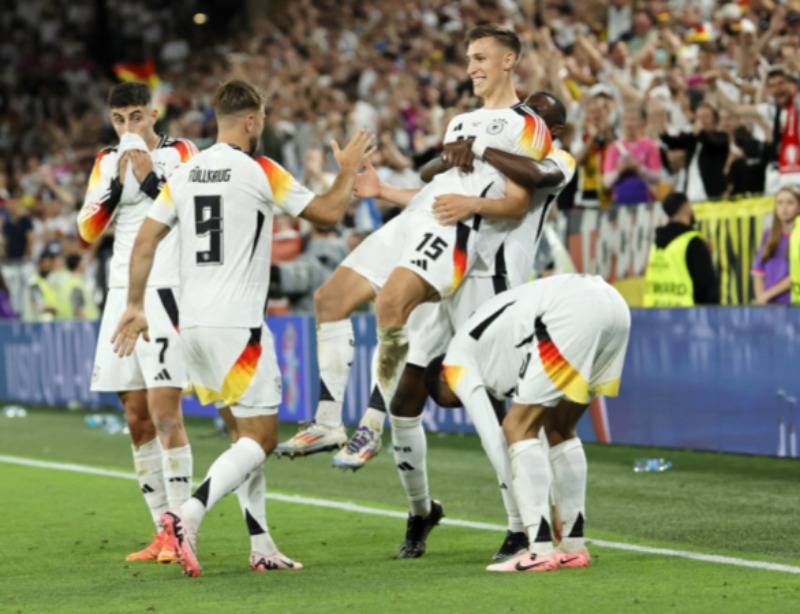 O primeiro tempo teve maior domínio alemão até a metade dele. E, com apenas três minutos o zagueiro Schlotterbeck balançou as redes, mas o gol foi anulado. Na metade, a Dinamarca ameaçou uma reação, que durou pouco, já que o jogo foi paralisado aos 35 minutos em razão de um temporal com raios e granizo. Na etapa complementar, a Alemanha voltou disposta a garantir a vaga para a próxima fase, jogou melhor que a seleção adversária e chegou aos gols com Havertz, de pênalti, Musiala. Wirtz ainda marcou nos acréscimos, mas a arbitragem pegou impedimento no início do lance.