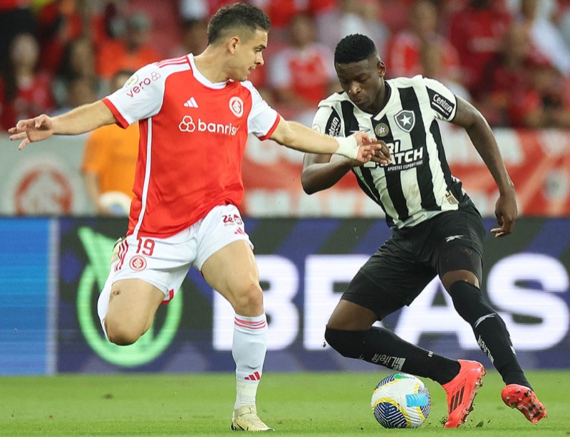 No ritmo de festa por conta da Libertadores, o Botafogo foi com tudo para cima do Inter. Com essa postura, o Glorioso logo foi recompensado. Aos cinco minutos, em uma jogada ensaiada de escanteio, Almada tabelou a bola com Alex Telles, cruzou para a entrada da área, onde Savarino estava livre para emendar um lindo voleio no canto do goleiro Rochet.