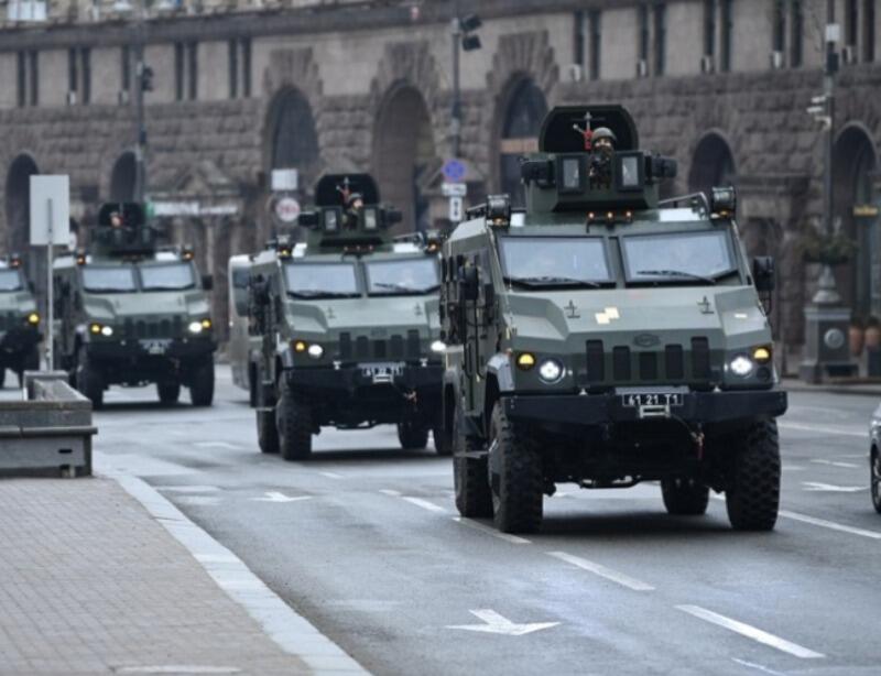 Veículos militares ucranianos passam pela Praça da Independência, no centro de Kiev, nesta quinta (24). Sirenes de ataque aéreo soaram no centro de Kiev hoje, quando cidades em toda a Ucrânia foram atingidas pelo que autoridades ucranianas disseram ser ataques de mísseis e artilharia russos — Foto: Daniel Leal/AFP