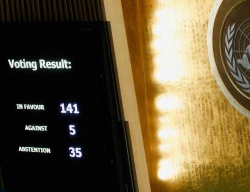 Os votos contrários foram de Belarus, Coreia do Norte, Eritreia, Rússia e Síria. Entre as nações que se abstiveram, estão China, Índia, África do Sul, Irã, Cuba, entre outros.