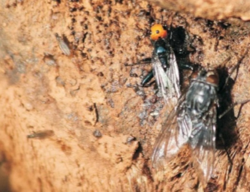 Trata-se, na verdade, da mosca de nome científico Thyreophora cynophila, que tem como característica a cabeça laranja brilhante.