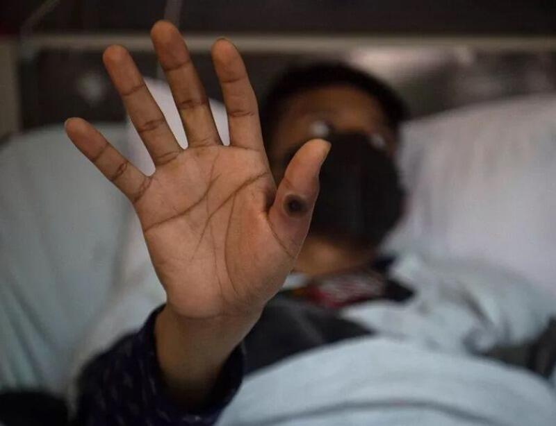 Já no sexto dia de sintomas, ele ainda tinha um quadro de febre, fadiga, dores de cabeça, além de dores na região da faringe. As lesões na pele se concentravam principalmente na palma da mão direita e na região perianal, com vesículas em diferentes estágios.