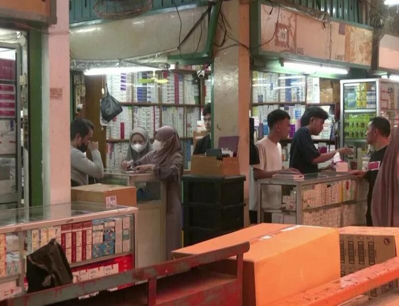 Farmácia na Indonésia com compradores e vendedores — Foto: REUTERS