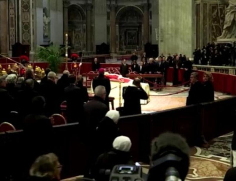 Seu corpo, vestido com paramentos litúrgicos vermelhos e dourados, foi colocado em um estrado simples, com dois guardas suíços de pé de cada lado enquanto os fiéis passam.