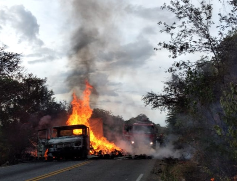Um caminhão-baú Mercedes 720, de cor branca e placa MYY-7028 de Serra Negra do Norte-RN, carregado com fios de algodão, pegou fogo após uma pane elétrica na tarde deste sábado, 09 de janeiro, na PB-262, na Serra do Teixeira, Região Metropolitana de Patos.
