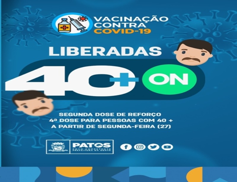 A Secretaria Municipal de Saúde de Patos disponibiliza a partir desta segunda-feira (27), a segunda dose de reforço (D4) contra a Covid-19 para pessoas com 40 anos ou mais.