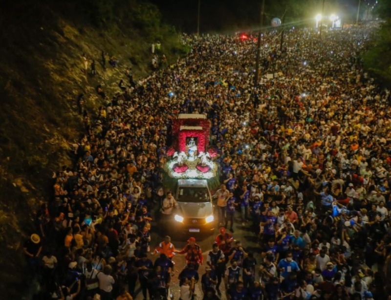 Os cantos e preces destinados à Nossa Senhora da Penha retomaram as ruas de João Pessoa neste sábado (26). Durante toda a noite e madrugada deste domingo (27), milhares de fiéis caminharam em procissão da Igreja de Lourdes, no Centro, até o Santuário da Penha, em rito de 259 anos de tradição que não ocorria desde 2019, devido à pandemia de Covid-19. O cortejo foi acompanhado pelo prefeito Cícero Lucena e a primeira-dama Lauremília Lucena.