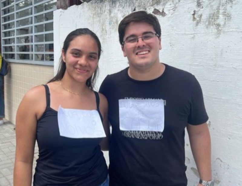 “Ajude-nos a casar” é o que diz o pedido escrito na placa que Caio Fernandes tem colada no peito, bem perto do coração. Com o casamento marcado para janeiro do ano que vem, e ele a noiva, Alane Venâncio, resolveram vender água em um dos maiores locais de provas do Enem em Campina Grande, Agreste da Paraíba. Todo o dinheiro arrecadado deve ajudar a pagar a festa.