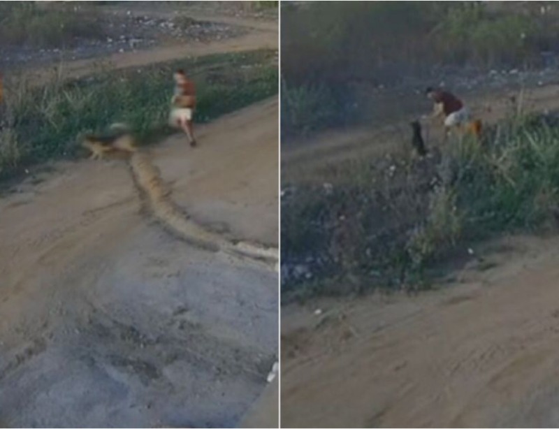 O dono do animal correu e interviu na situação para afastar o cão. Além dele, um terceiro indivíduo estava próximo e, utilizando algum tipo de artefato, dispersa o animal.