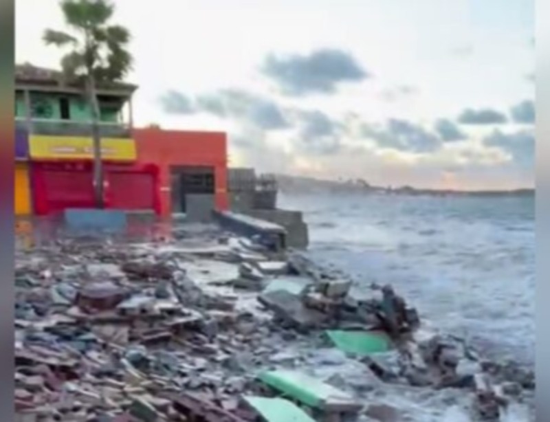 Em imagens é possível observar o estrago na praça central que teve novamente bancos, piso e quebrar-mar destruídos.
