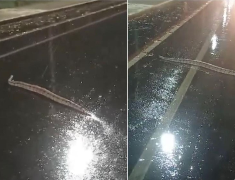 Ao passar pela Alça Sudeste, eles se depararam com uma cobra jiboia atravessando a via, durante a chuva que caía na cidade.