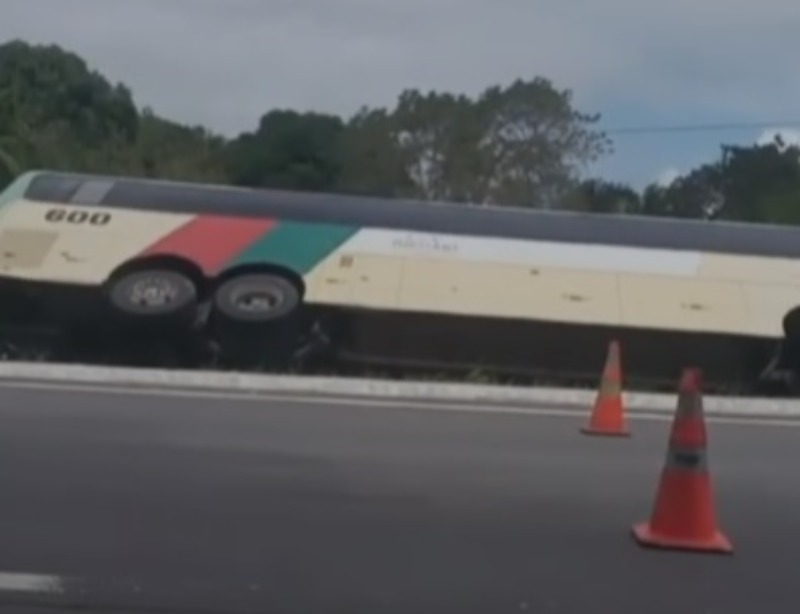 Um ônibus que seguia em direção a Campina Grande tombou na BR-230, nas proximidades de Café do Vento, próximo ao posto da Polícia Rodoviária Federal (PRF). O caso ocorreu na manhã deste domingo (14).