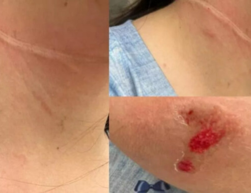 Elaine se enroscou nos fios e sofreu lesões no pescoço e ferimentos devido ao impacto que resultou na sua queda, com marcas visíveis na pele.