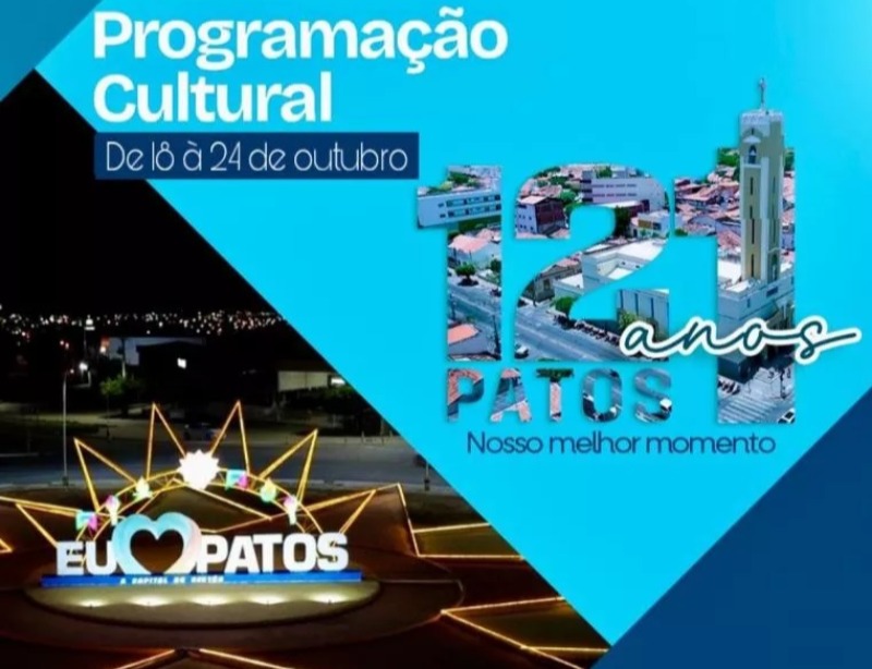 Patos, a Capital do Sertão, no estado da Paraíba, celebra 121 anos no próximo dia 24 de outubro, e a Prefeitura Municipal, por meio da Secretaria de Cultura e Turismo (Secult), realizará uma programação cultural na Concha Acústica, localizada na Praça Edivaldo Motta, no centro.