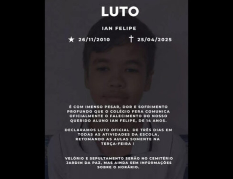 É com imenso pesar, dor e sofrimento profundo que o Colégio FERA comunica oficialmente o falecimento do nosso querido aluno Ian Felipe, de 14 anos.