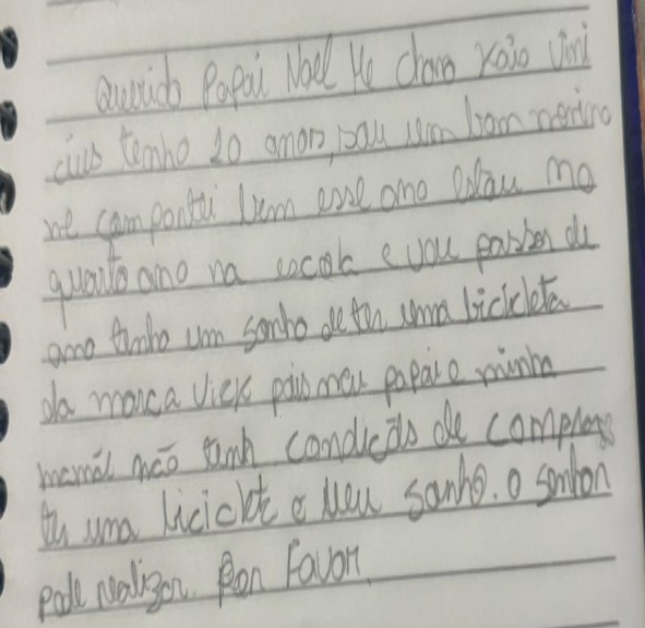 Ele escreveu que é um bom menino, se comportou bem em 2025 e que vai ser aprovado nas matérias escolares. Ainda no texto, Kaio relata que ter uma bicicleta é seu sonho, acrescentando que seus pais não possuem condições de comprar o item. Veja: