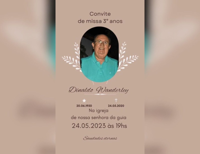 A família do ex-prefeito Dinaldo Wanderley estará realizando nesta quarta-feira, dia 24, às 19h, na Igreja Catedral de Nossa Senhora Da Guia, a missa em memória ao terceiro aniversário de sua morte, ocorrida no dia 20 de maio de 2020, em João Pessoa, vítima de Covid-19.