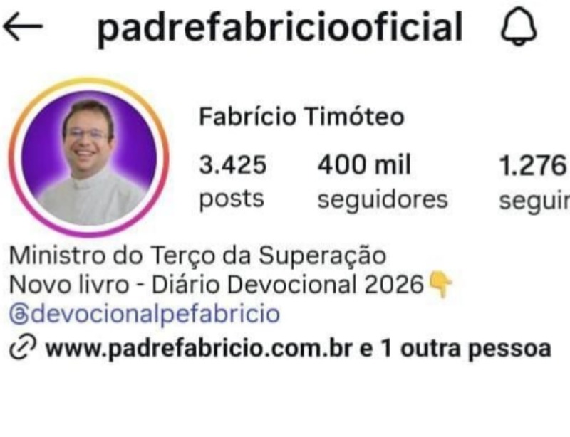 O padre Fabrício Dias Timóteo atingiu uma marca expressiva em sua missão de evangelização digital. Por meio do perfil oficial no Instagram, “Padre Fabrício Oficial”, o sacerdote chegou aos 400 mil seguidores, reunindo diariamente milhares de fiéis que acompanham suas mensagens de fé, reflexões sobre o Evangelho e palavras de acolhimento.
