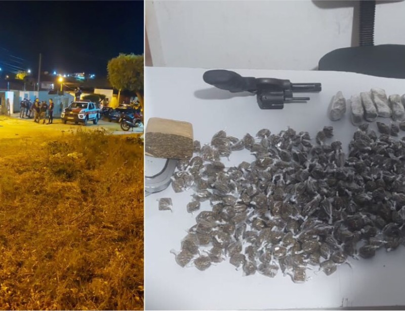 Uma arma de fogo e porções de drogas foram apreendidas com os suspeitos.
