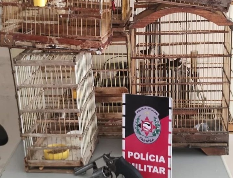 No interior da casa, foram apreendidos oito pássaros de diferentes espécies, oito gaiolas e um revólver calibre 38.