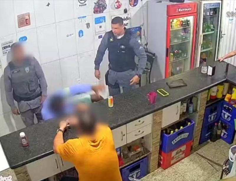 Nas imagens, cinco pessoas estão no bar, quando dois policiais entram no local e cumprimentam os demais. Um dos militares vai em direção a um homem de camisa azul, que estava sentado e bebendo algo.