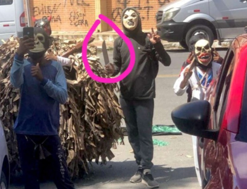 Testemunhas relataram que os mascarados assustavam crianças com seus relhos, pediam dinheiro de forma agressiva, cometiam pequenos furtos em lojas e ameaçavam comerciantes e clientes com uma faca.