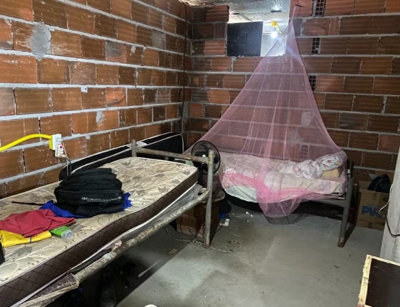 Em uma das fiscalizações, 12 trabalhadores dormiam em um cômodo de alvenaria sem acabamento, com fiação exposta e colchões desgastados. O local era compartilhado com ferramentas e baldes de tinta.