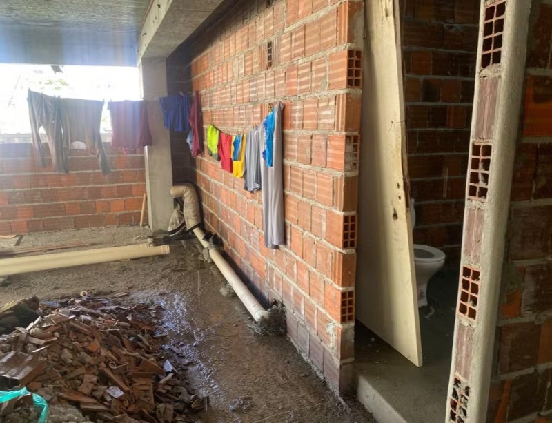 Já em outra obra, 17 pessoas ocupavam um espaço ainda em construção, com paredes de tijolos e painéis de madeira. Alguns precisavam dormir do lado de fora por causa de alagamentos. Ainda nesse endereço, outros quatro trabalhadores estavam em um cômodo pequeno, sem ventilação e sem espaço para circulação.