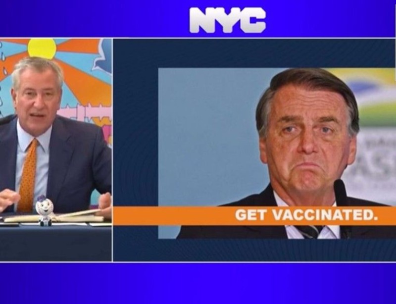 O prefeito de Nova York, Bill de Blasio, disse nesta segunda-feira (20) em um pronunciamento, citando o presidente brasileiro Jair Bolsonaro, que se ele não quiser se vacinar "nem precisa vir" à cidade.