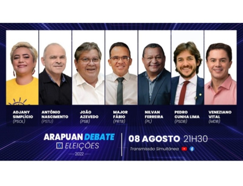 O Sistema Arapuan, realizará nesta segunda-feira (8), às 21h30 na TV Arapuan, afiliada da RedeTV! na Paraíba, debate entre todos os candidatos ao Governo da Paraíba. O debate terá a mediação do jornalista e apresentador Luís Tôrres.