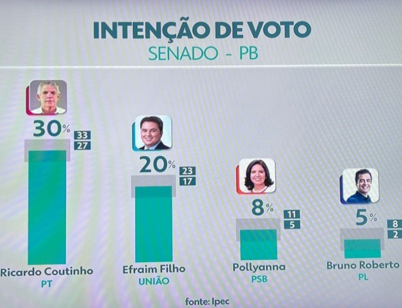 A Pesquisa do Ipec divulgada nesta segunda-feira (29) e encomendada pela TV Cabo Branco também revela os índices de intenção de voto para o cargo de senador pela Paraíba. O candidato do PT, Ricardo Coutinho, lidera a disputa com 30% das intenções de voto. Efraim Filho, do União Brasil, aparece na segunda posição com 20%. Os paraibanos vão eleger um senador em 2022.