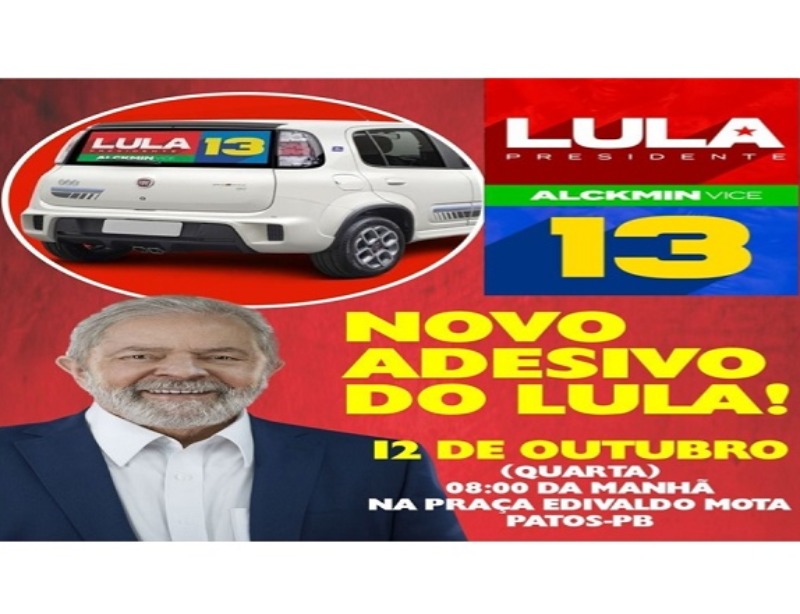 “Olá galera do Lula, nesta quarta-feira, 12, às 08h da manhã, grande adesivaço de Lula Presidente. Leve o seu carro, convide um amigo, uma amiga. Vamos adesivar e mostrar que Patos vai dar a maior vitória a Lula no segundo turno”, disse Lenildo.