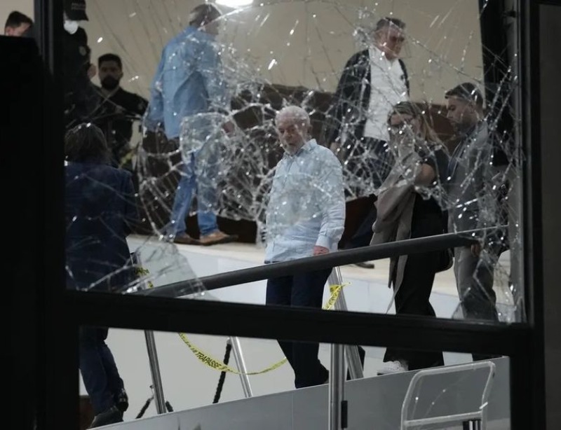 Lula visitou primeiramente o Planalto. O presidente encontrou o mobiliário destruído, vidraças quebradas e obras de arte rasgadas.