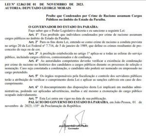 O Governo da Paraíba sancionou a lei proposta pelo deputado estadual George Morais que veta a nomeação para cargos públicos — de forma direta ou indireta — dos condenados por racismo ou injúria racial.