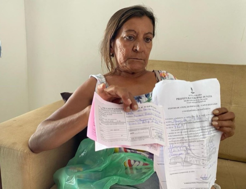 A dona de casa tem depressão e depende da medicação fornecida pela Farmácia Popular, mas vem tomando as medicações com irregularidade. Ela relatou que uma filha conseguiu a medicação com uma mulher que usa a mesma medicação em Cajazeiras, porém, os remédios acabaram e ela não tem dinheiro para comprar.