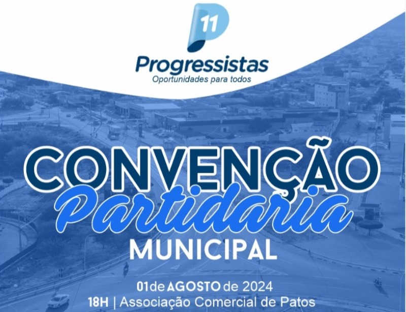 O Presidente da Comissão Provisória Municipal de Patos do Partido Progressistas - PP, na forma que dispõem os artigos 12, 19 e 30 do Estatuto Partidário e legislação eleitoral vigente, convocam os senhores Convencionais e filiados com direito a voto, para comparecerem à Convenção Municipal do PP a ser realizada no dia 01 de Agosto de 2024, a parti das 18:00 às 22:00 horas, tendo por local a Associação Comercial de Patos, localizada na Rua José Gomes Alves, 91, Centro, neste município.