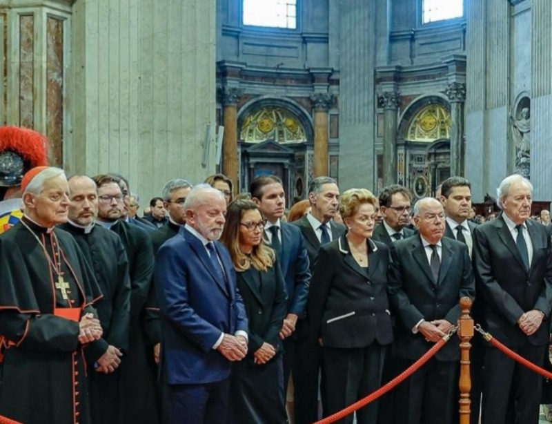 O presidente Lula e autoridades brasileiras foram ao velório do papa Francisco, nesta sexta-feira (25), na Basílica de São Pedro, em Roma. Na comitiva, estavam presentes a presidente do banco Brics Dilma Rouseff, a primeira-dama Janja, ministros e parlamentareso presidente da Câmara dos Deputados Hugo Motta, o presidente do Senado Davi Alcolumbre, o presidente do Supremo Tribunal Federal Luís Roberto Barroso, o ministro da Justiça Ricardo Lewandoswki.