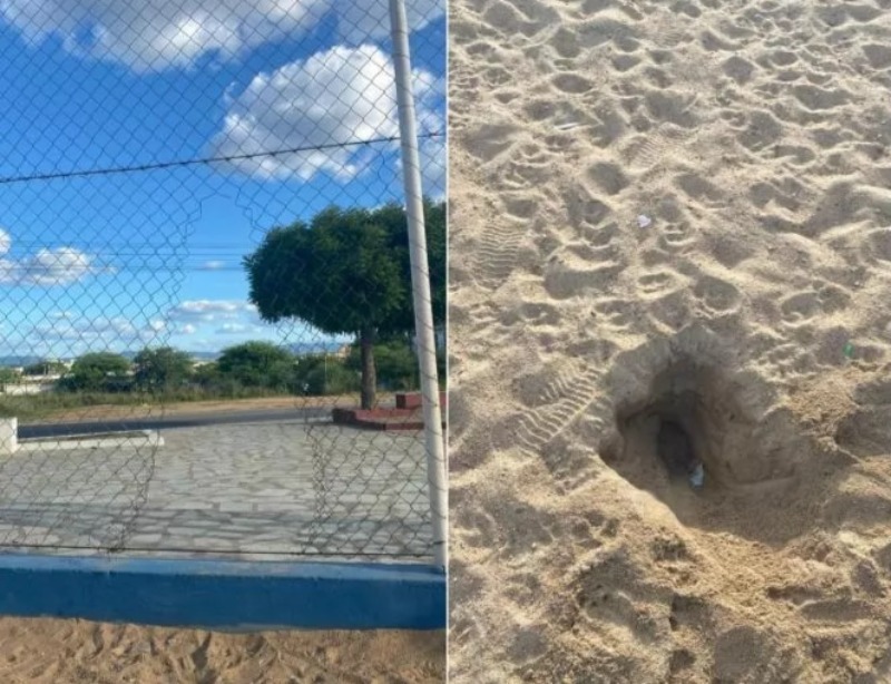 Além disso, a quadra de areia, espaço frequentemente utilizado por jovens para a prática de esportes como vôlei e futebol, está praticamente inutilizável. Falta areia adequada, e o terreno está repleto de pedras e irregularidades, o que aumenta o risco de lesões durante as atividades físicas.