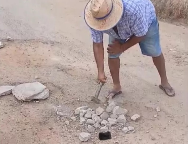 A atitude de Geraldo não foi por capricho, mas por necessidade. Pouco antes, o morador teve o pneu do carro danificado ao passar pela rua esburacada. Revoltado e sem esperar ajuda do poder público, seu Geraldo decidiu agir por conta própria para evitar que outros motoristas e motociclistas sofressem o mesmo prejuízo.